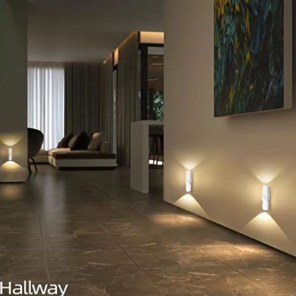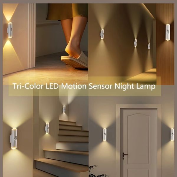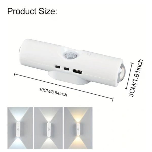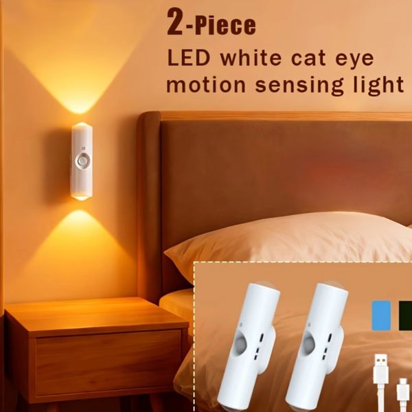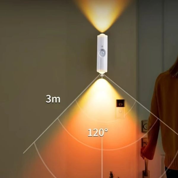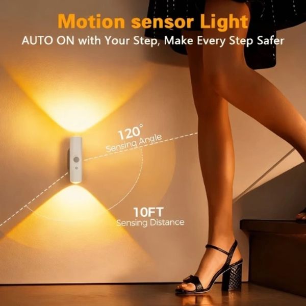 Motion sensor lighting - ideal for stairs, hallways, bathrooms, kitchens, dining rooms, bedrooms, closets, cabinets, workshops, basements, garages, storages, offices, vehicles, campers, commercial stores, factories etc. Each motion sensor lighting unit has 2-LED cat eye wall lights with Tri-Color ambient lighting for your selected tone. This Smart Human Sensor Hill Lamp has a spotlight motion sensor light that comes on when you walk up to it. It senses your movement and comes to life while you are in motion. It is a magnetic charging, self-adhesive lighting unit that requires no wiring and is fully rechargeable with enclosed USB.